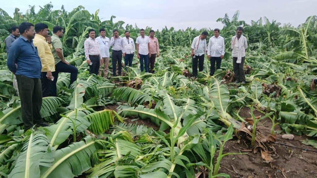 जामनेर( प्रतिनिधी):- दि.६ मे रोजी आलेल्या वादळी वाऱ्यांसह मुसळधार पावसामुळे तालुक्यातील हिवरखेडे बु.येथील शेतकऱ्यांच्या केळी पिकांचे मोठ्या प्रमाणावर नुकसान झाले असून. याबाबत तात्काळ पाहणी करण्यासाठी विनय गोसावी उपविभागीय अधिकारी जळगाव, नानासाहेब आगळे तहसीलदार जामनेर, तालुका कृषी अधिकारी, जामनेर, तसेच स्थानिक पदाधिकारी, ग्रामस्थ व शेतकरी बांधव यांच्या उपस्थितीत घटनास्थळी जाऊन पाहणी करण्यात आली.या पाहणीनंतर प्रांताधिकारी, जळगाव यांनी ग्रामस्तरीय अधिकाऱ्यांना तात्काळ पंचनामे करून नुकसानग्रस्त शेतकऱ्यांना मदतीसाठी प्रस्ताव सादर करण्याचे स्पष्ट निर्देश दिले आहेत.