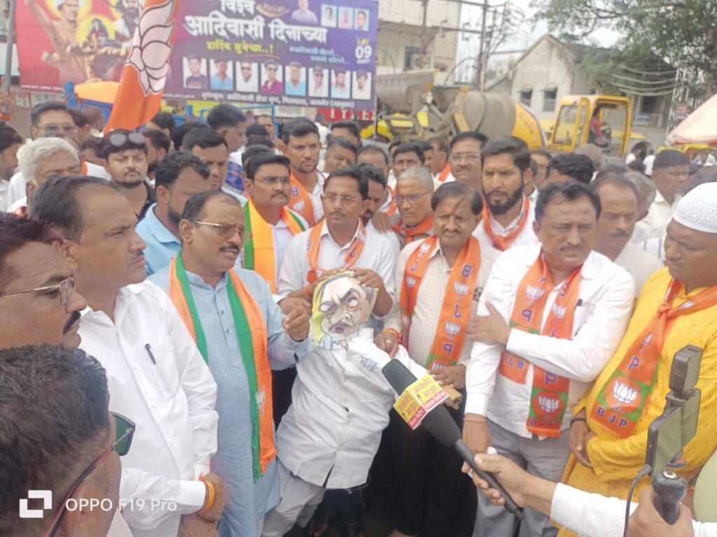 जामनेर (प्रतिनिधी):- महिला आयोगाच्या अध्यक्षा रूपालीताई चाकणकर यांनी केलेल्या गंभीर खुलास्यानंतरही आ.एकनाथराव खडसे यांनी आपल्या जावयाचे समर्थन करत महिलांच्या अस्मितेचा अपमान केला हे वर्तन निंदनीय, लज्जास्पद आणि काळिमा फासणारे असल्याचे मत जामनेर भाजप च्या वतीने व्यक्त करत त्याचा निषेध म्हणून जामनेरात आंदोलन करण्यात आले. यावेळी प्रतिकात्मक पुतळ्याची अंत्ययात्रा काढत येथील राजमाता जिजाऊ चौकात आमदार एकनाथ खडसे यांचा प्रतिकात्मक पुतळा दहन करण्यात येऊन निषेधाच्या घोषणा देण्यात आल्या. यावेळी भारतीय जनता पक्षाचे जळगांव पूर्वचे जिल्हाध्यक्ष चंद्रकांत बाविस्कर, जा. ता. एज्युकेशन सोसायटीचे सचिव जितेंद्र पाटील, नगर परिषदेचे माजी उपनगराध्यक्ष प्रा. शरद पाटील, महेन्द्र बावीस्कर, स्वीय सहाय्यक दीपक तायडे, माजी नगरसेवक अतिश झालटे, शहर अध्यक्ष रवींद्र झालटे , माजी जिल्हा परिषद सभापती प्रदीप लोढा,खलील भांझा, जितेश पाटील, उल्हास पाटील, सुहास पाटील यांच्या सह तालुक्यातील भाजपचे पदाधिकारी, कार्यकर्ते मोठ्या संख्येने उपस्थित होते.